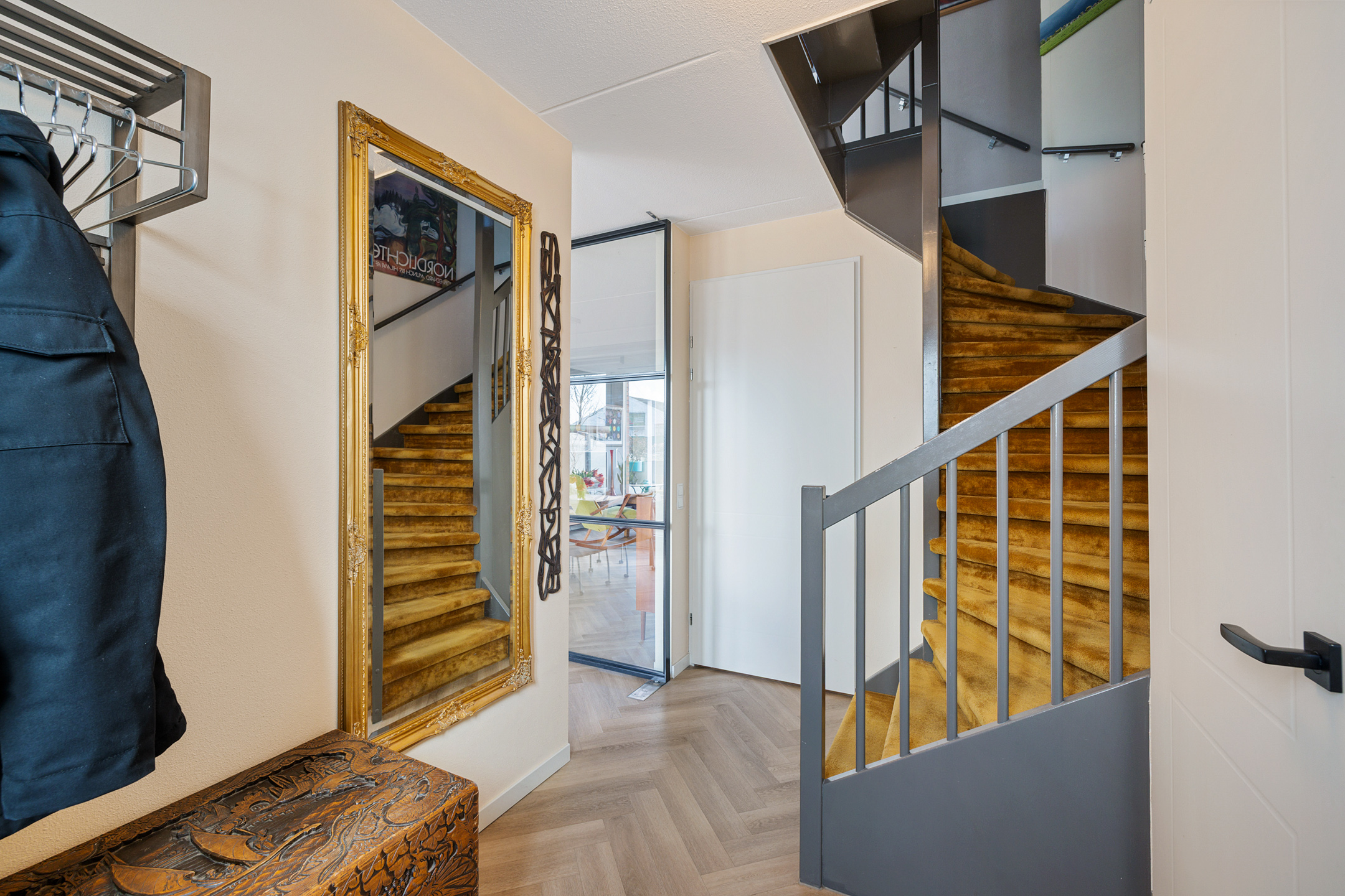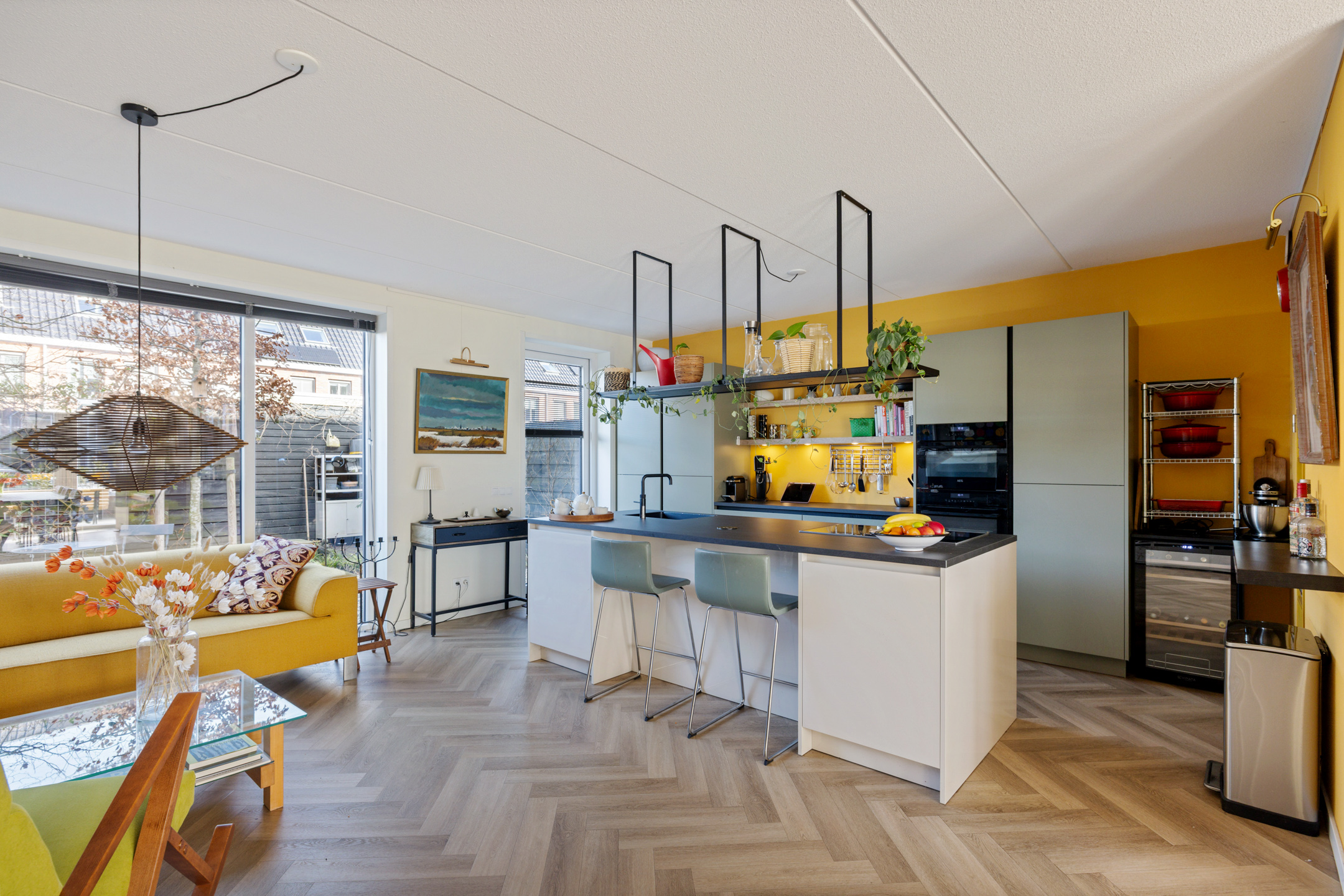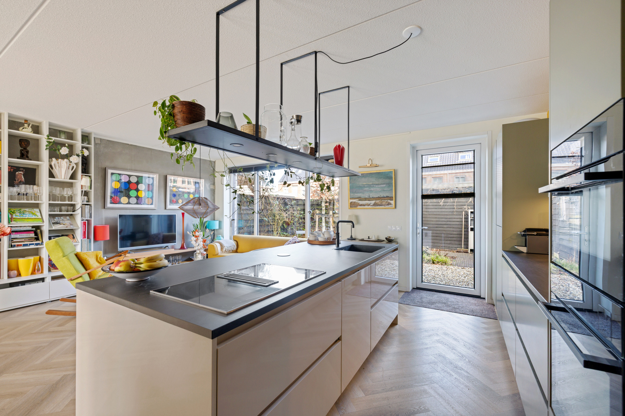 begane grond: hal, zwevend toilet. Royale woonkamer met schuifpui aan de voorzijde naar het heerlijk zonnige terras. Fraaie PVC visgraat vloer met vloerverwarming. Riante woonkeuken met een zeer uitgebreide en smaakvolle inbouwkeuken voorzien van een eiland met inductiekookplaat en geïntegreerde afzuiging. Voorts een vaatwasser, Quooker, stoomoven, combi-oven, grote koelkast en vriezer. Bijzonder praktische verscholen opbergkast onder de trap.