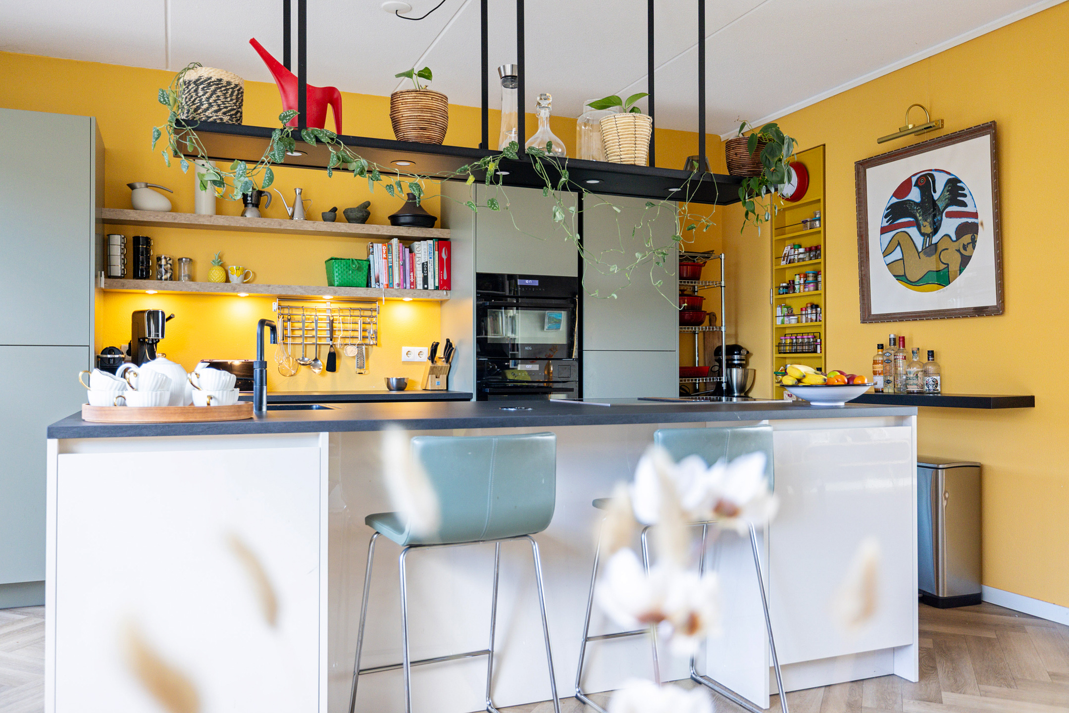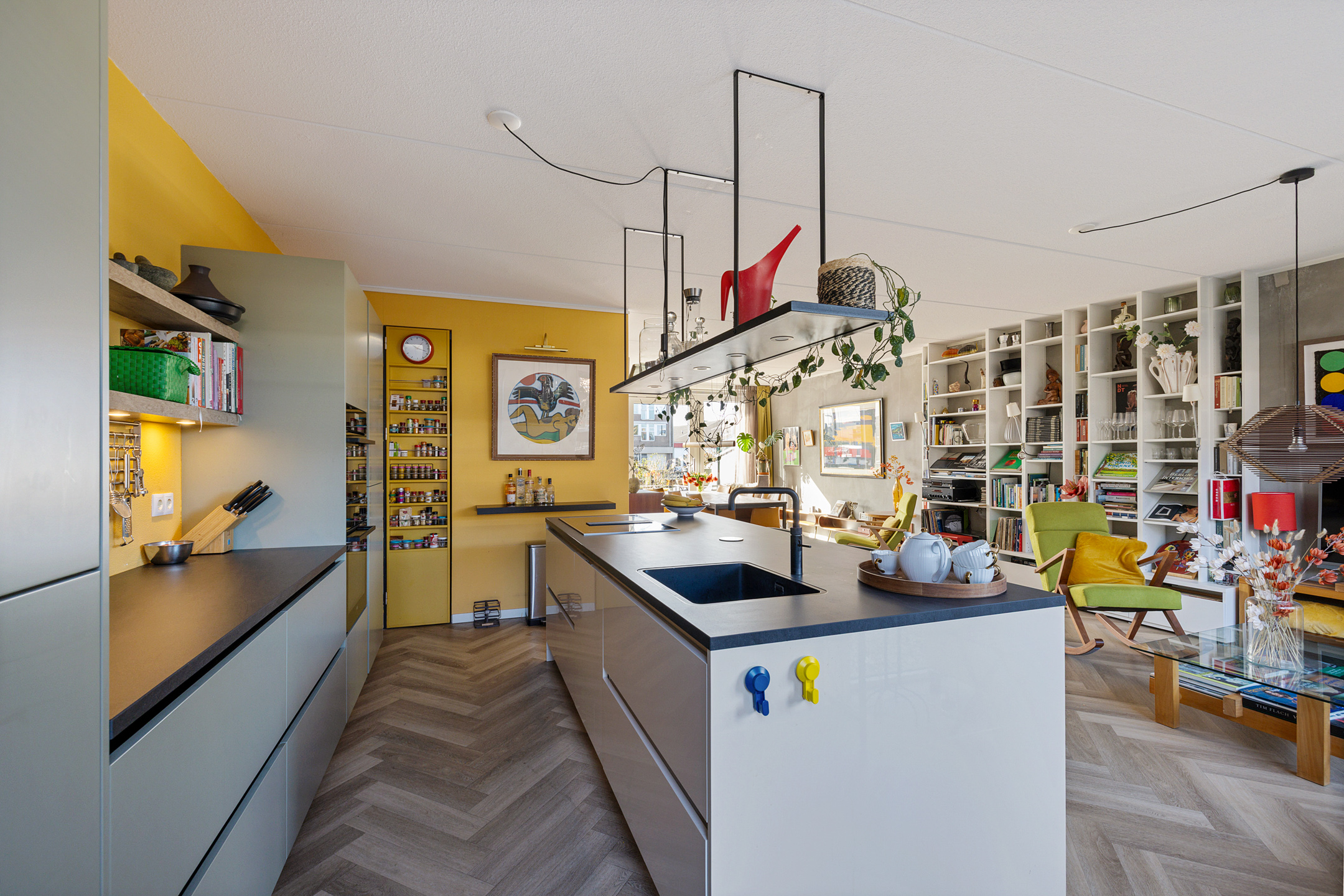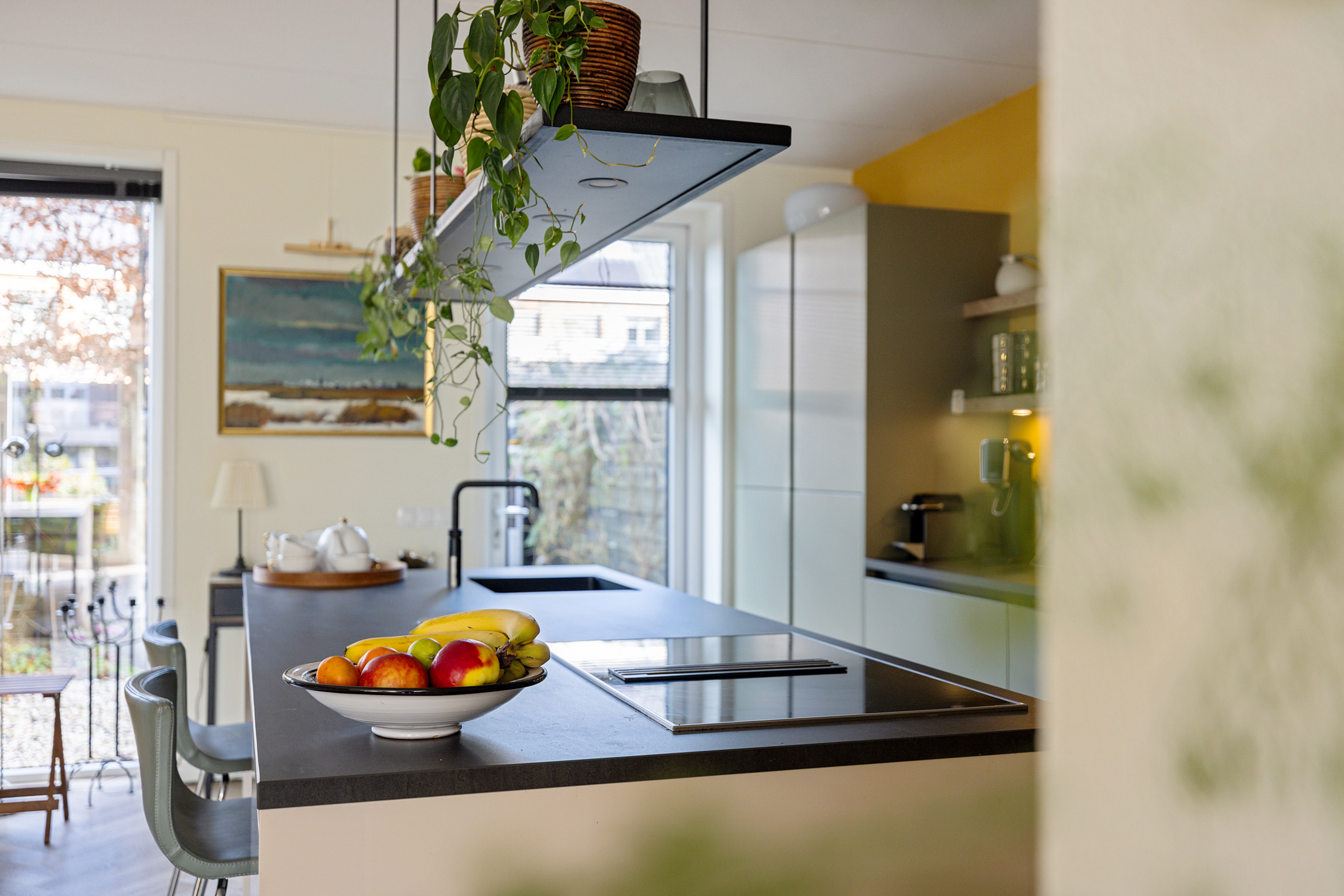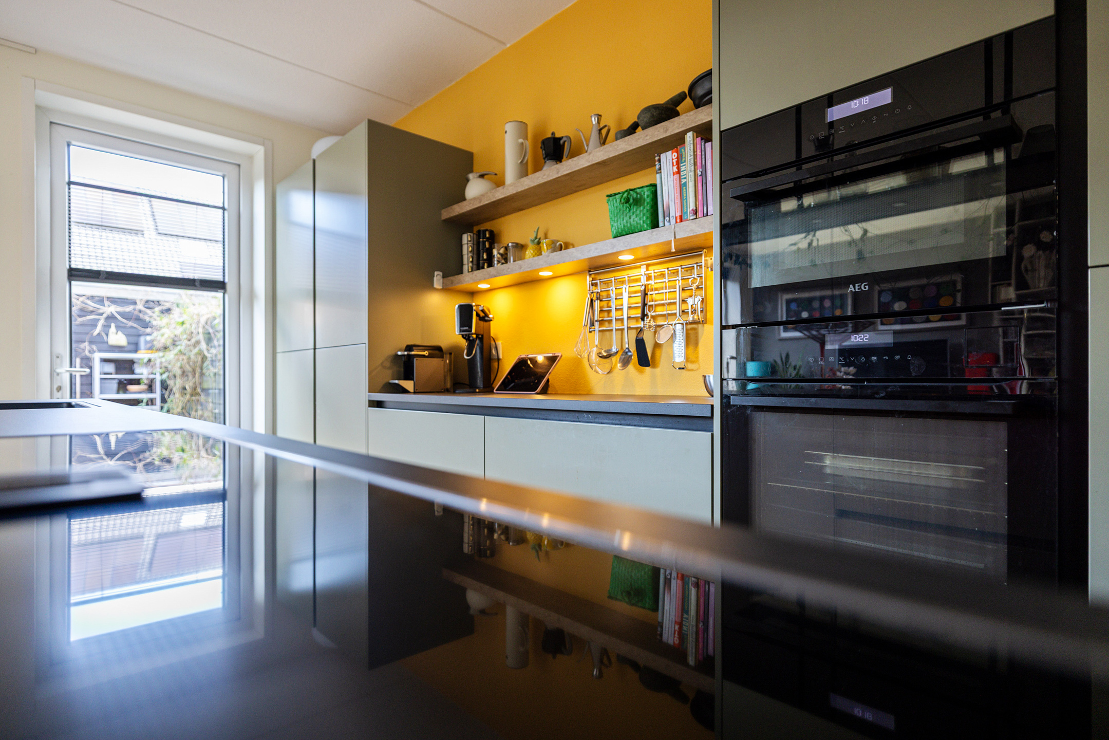 begane grond: hal, zwevend toilet. Royale woonkamer met schuifpui aan de voorzijde naar het heerlijk zonnige terras. Fraaie PVC visgraat vloer met vloerverwarming. Riante woonkeuken met een zeer uitgebreide en smaakvolle inbouwkeuken voorzien van een eiland met inductiekookplaat en geïntegreerde afzuiging. Voorts een vaatwasser, Quooker, stoomoven, combi-oven, grote koelkast en vriezer. Bijzonder praktische verscholen opbergkast onder de trap.