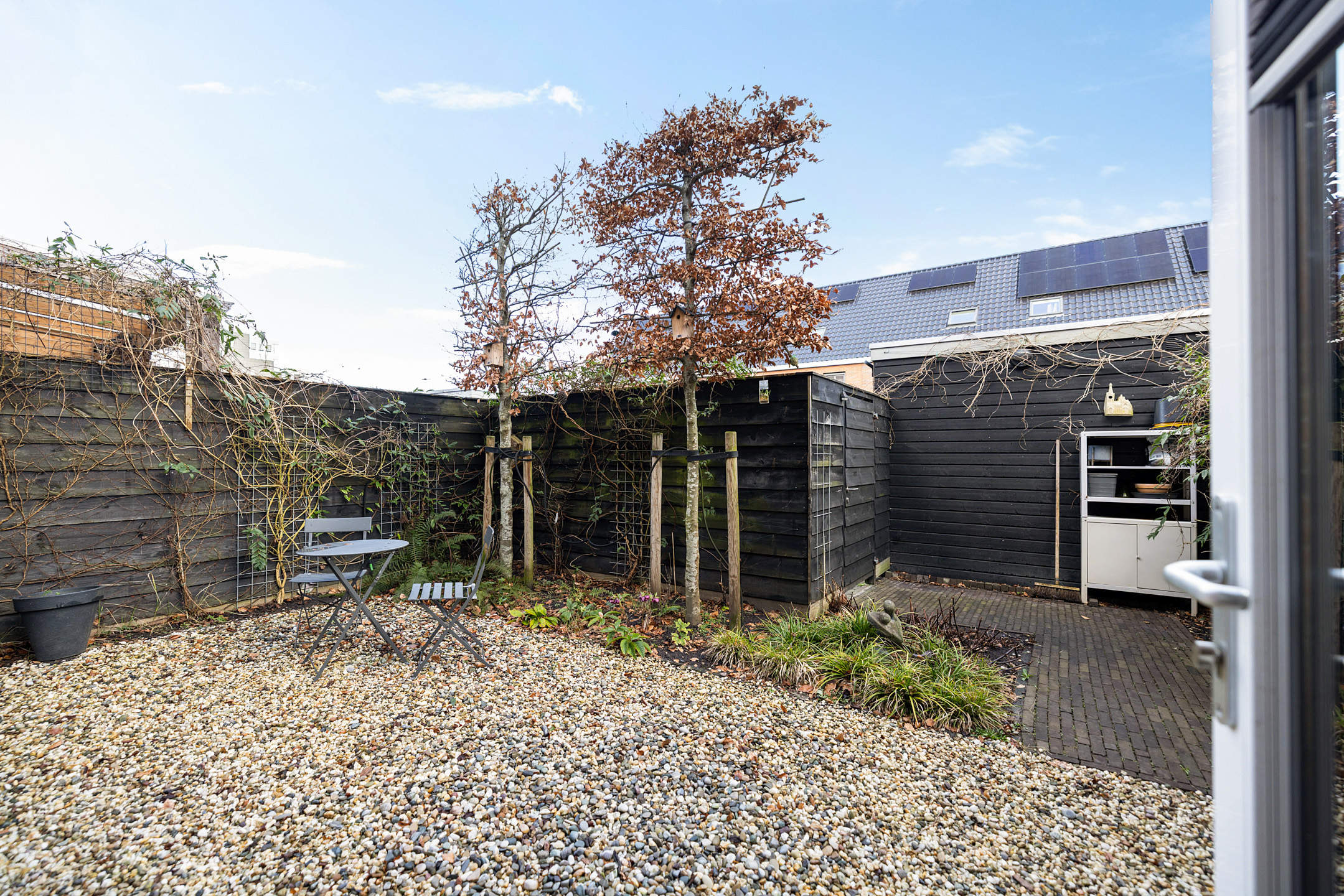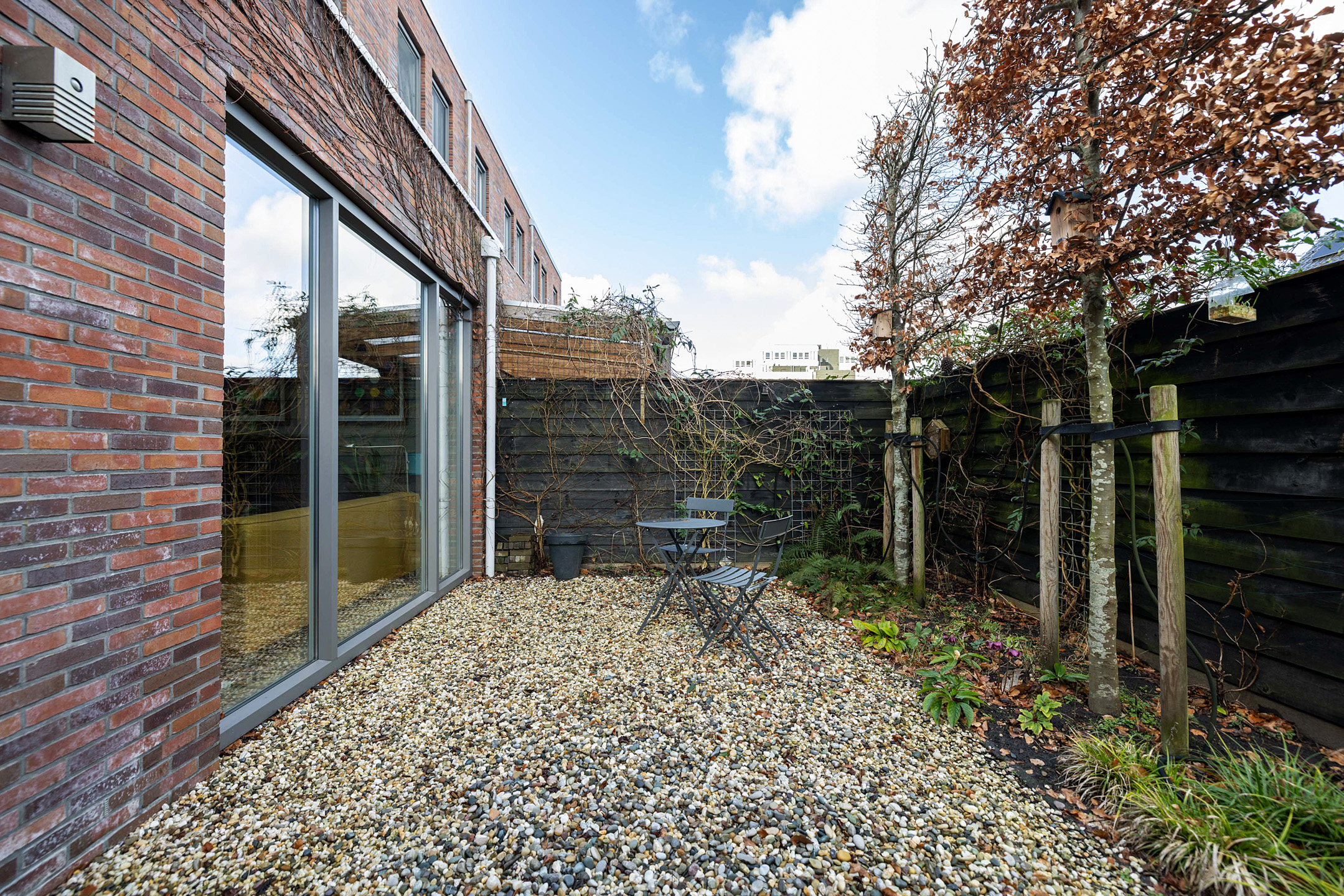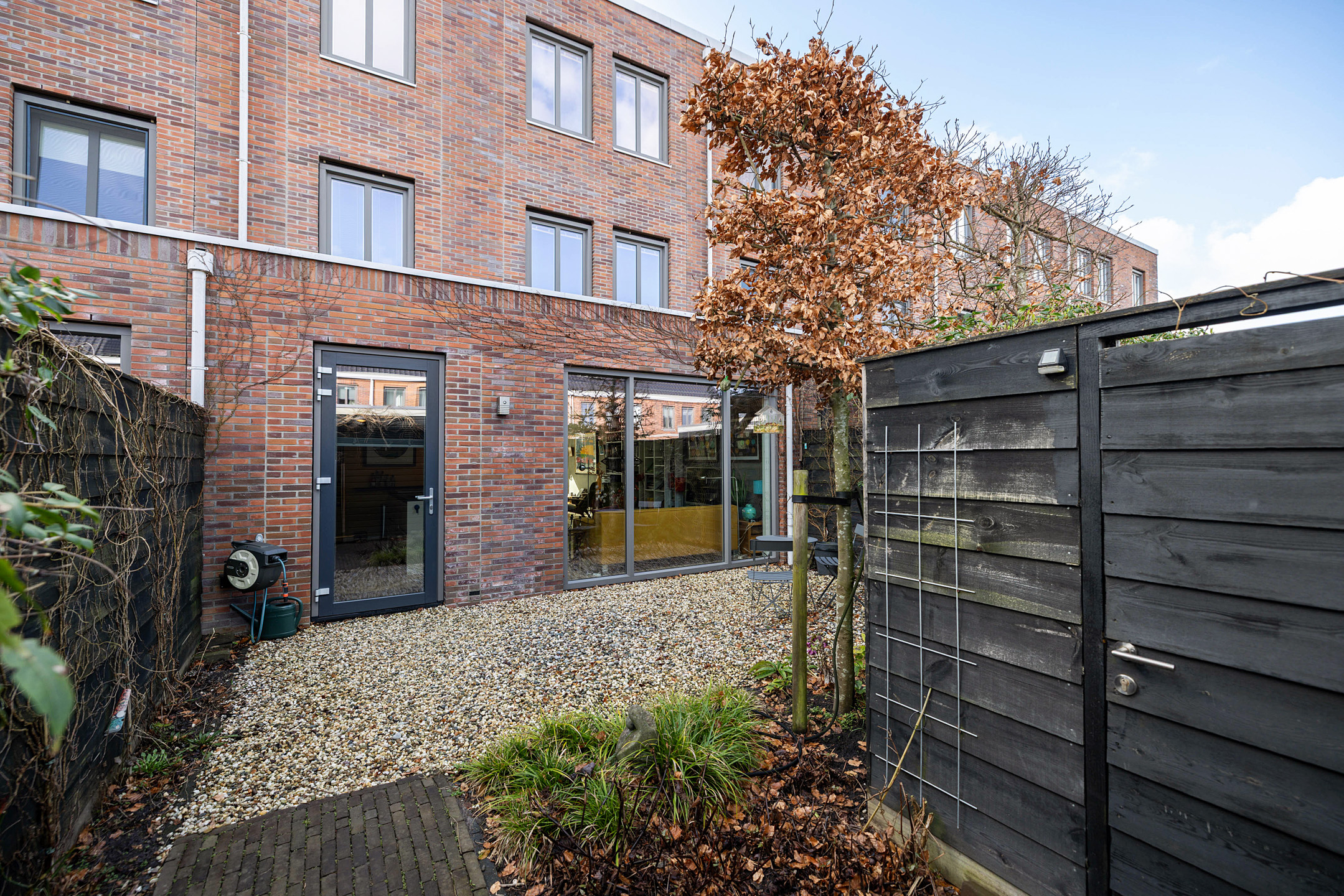 Deur naar de achtertuin met veel privacy. Hier is ook de buitenberging en de parkeerplaats op eigen erf.