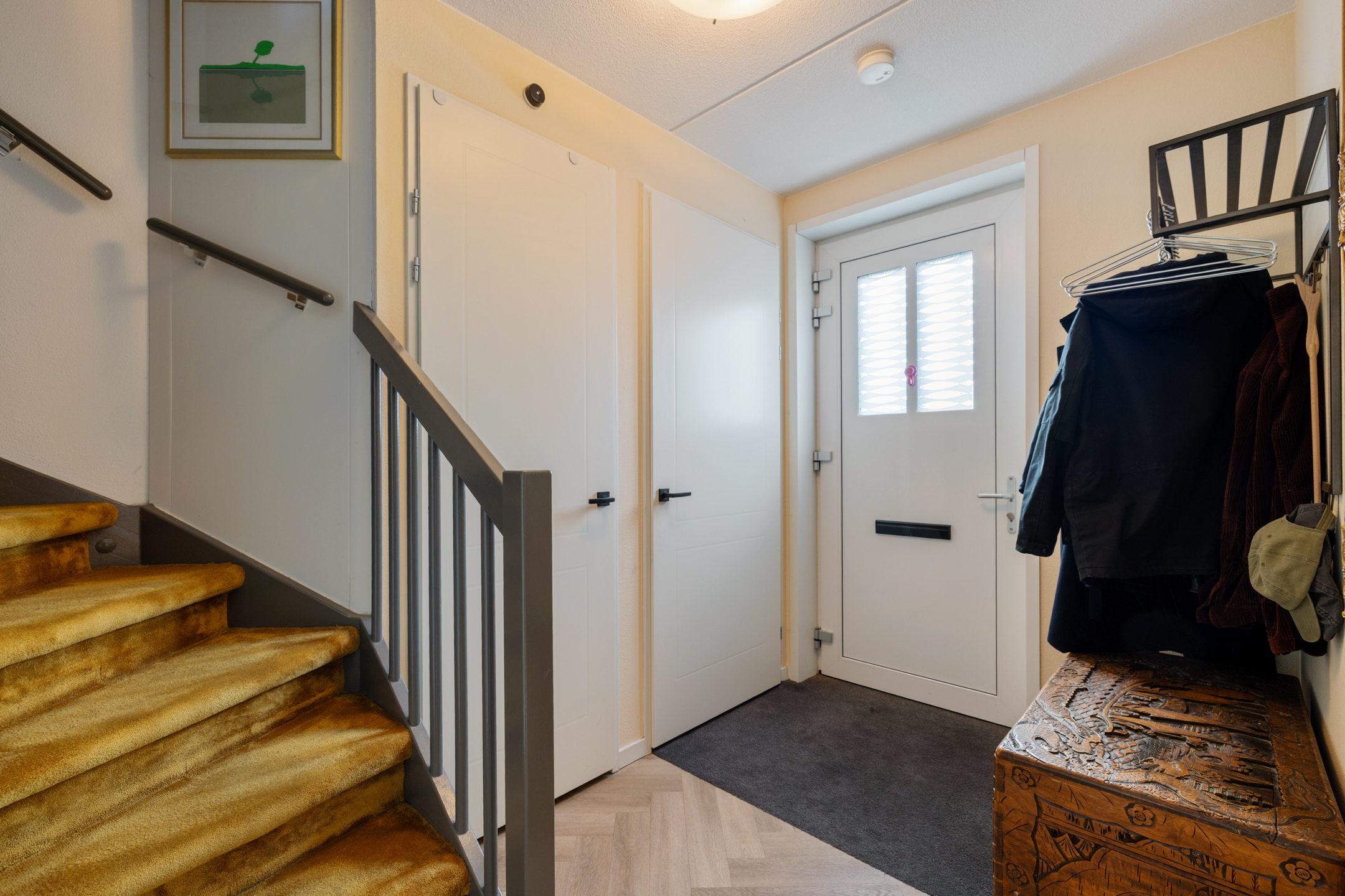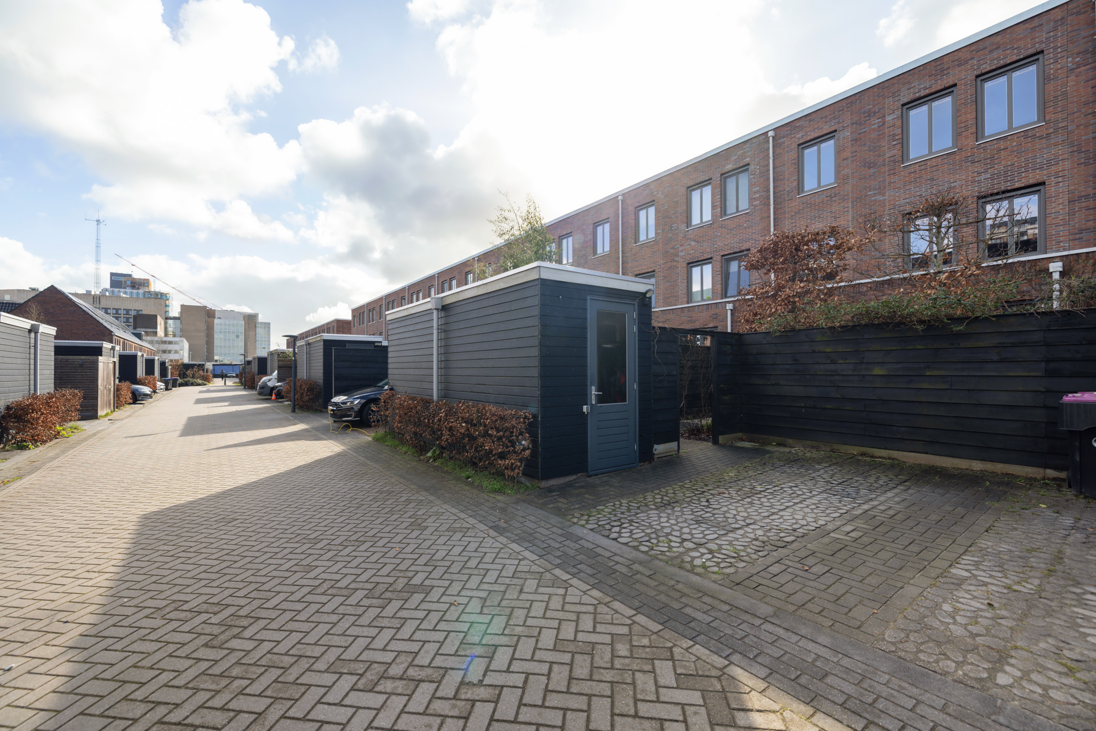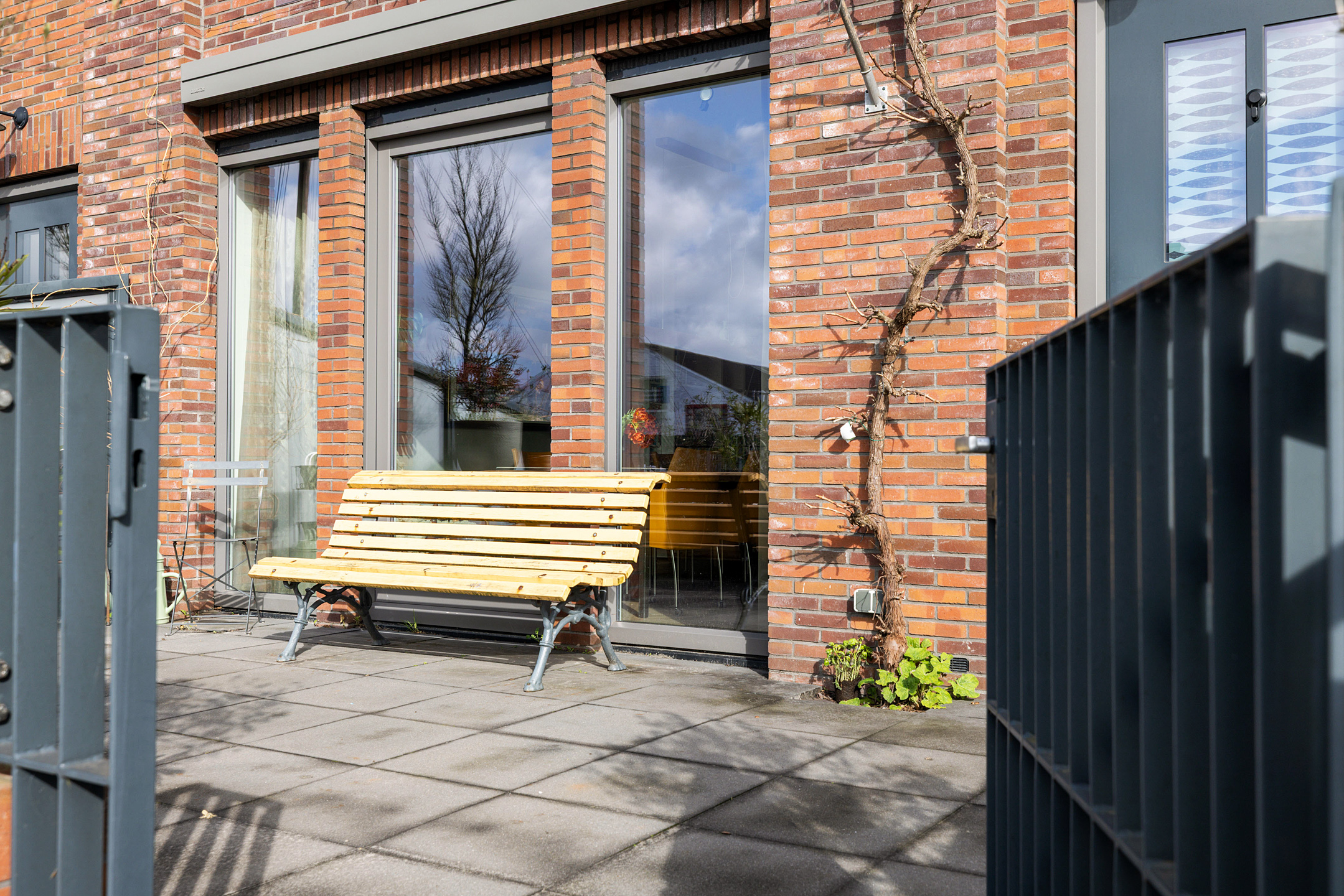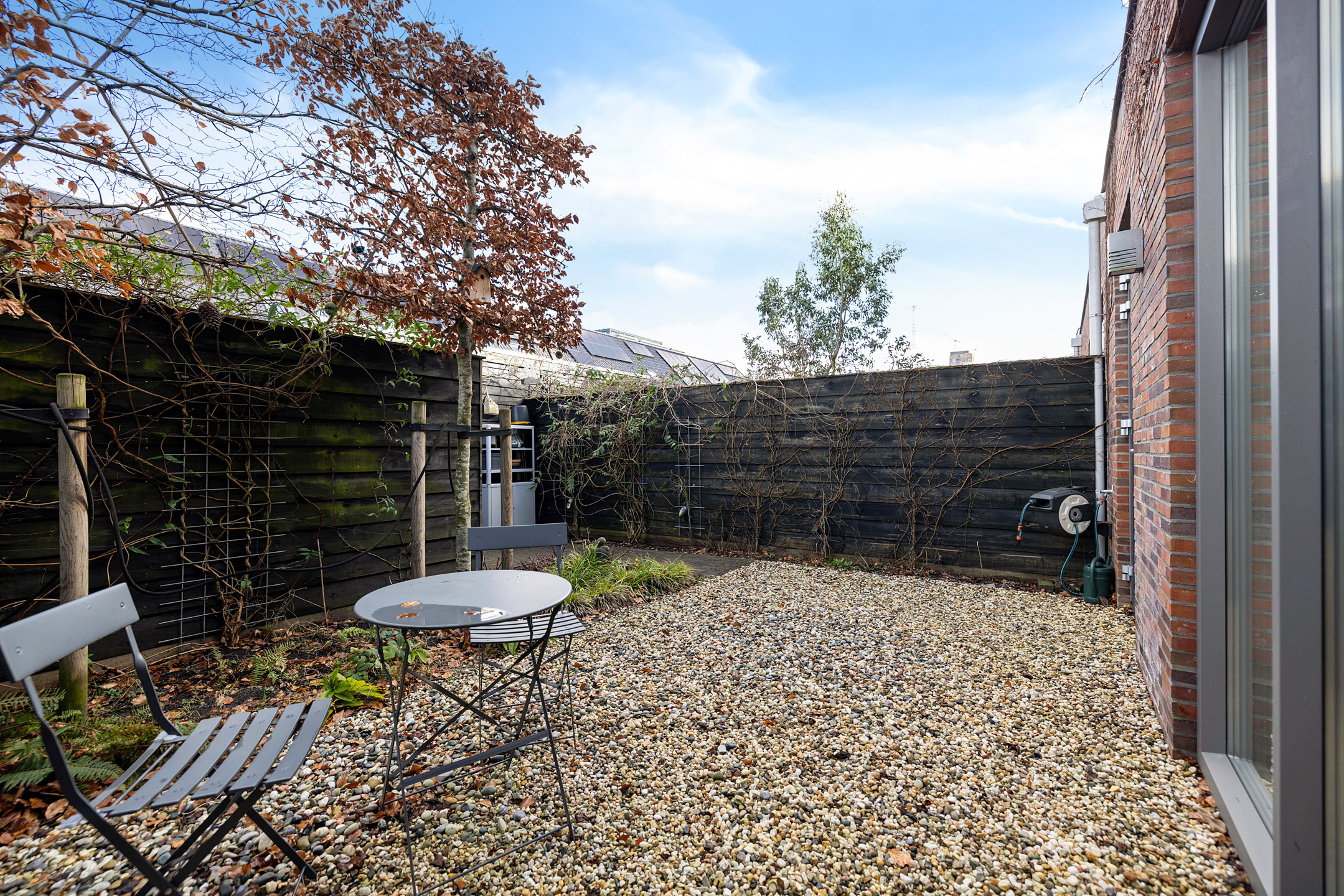 Deur naar de achtertuin met veel privacy. Hier is ook de buitenberging en de parkeerplaats op eigen erf.