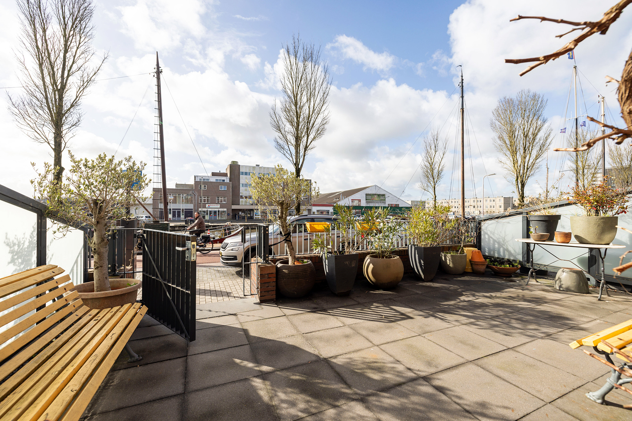 -terras in het zonnetje met zicht op de boten