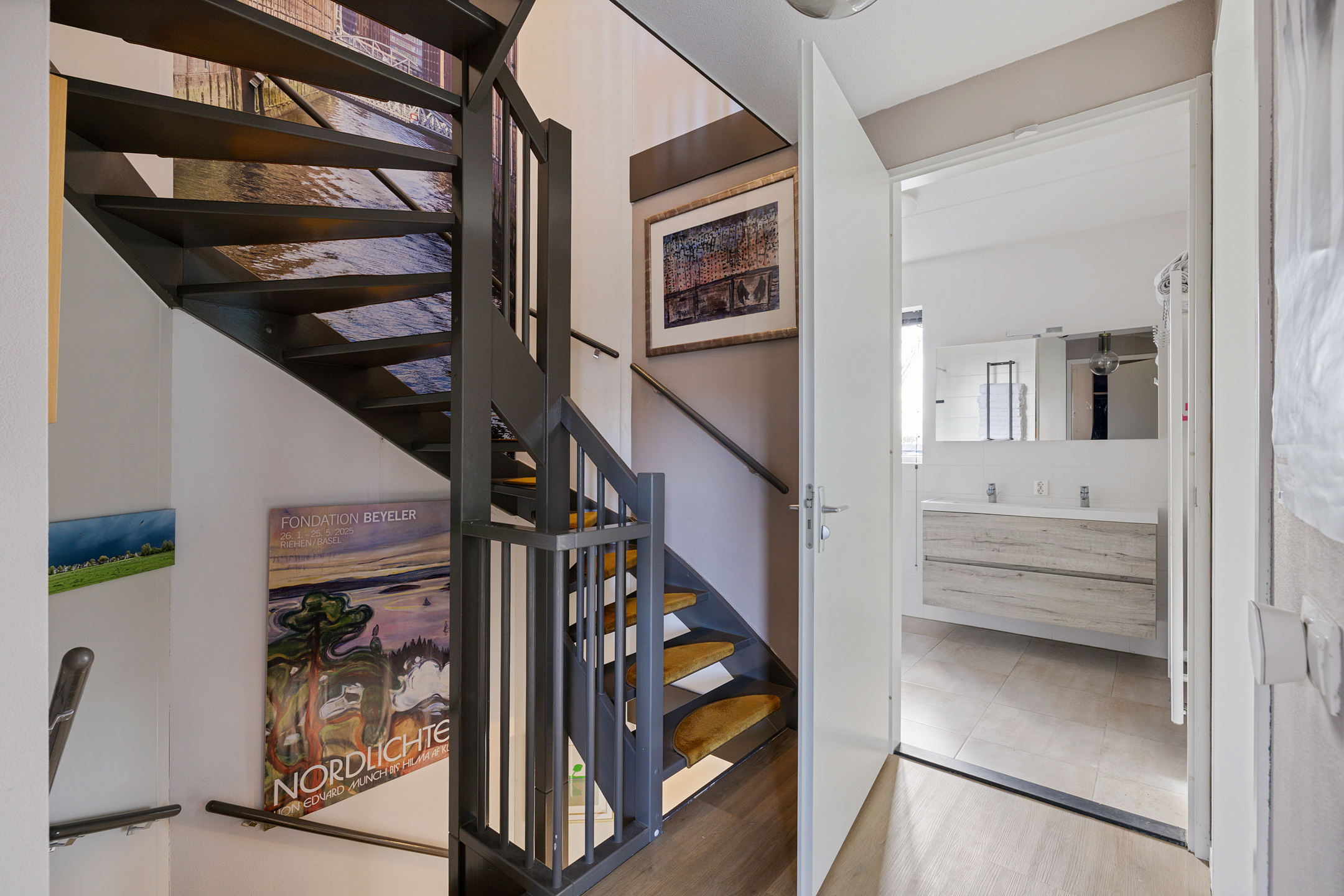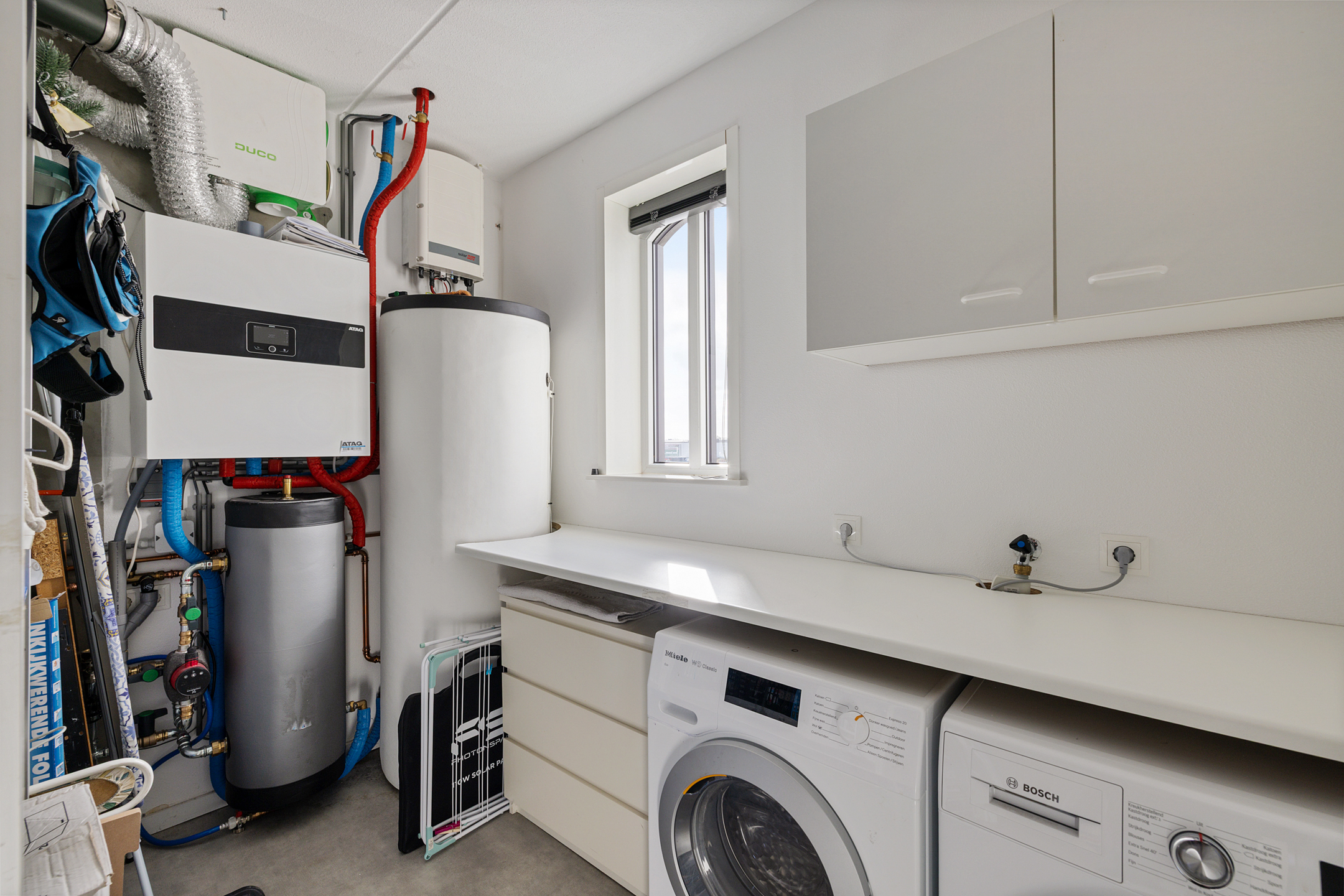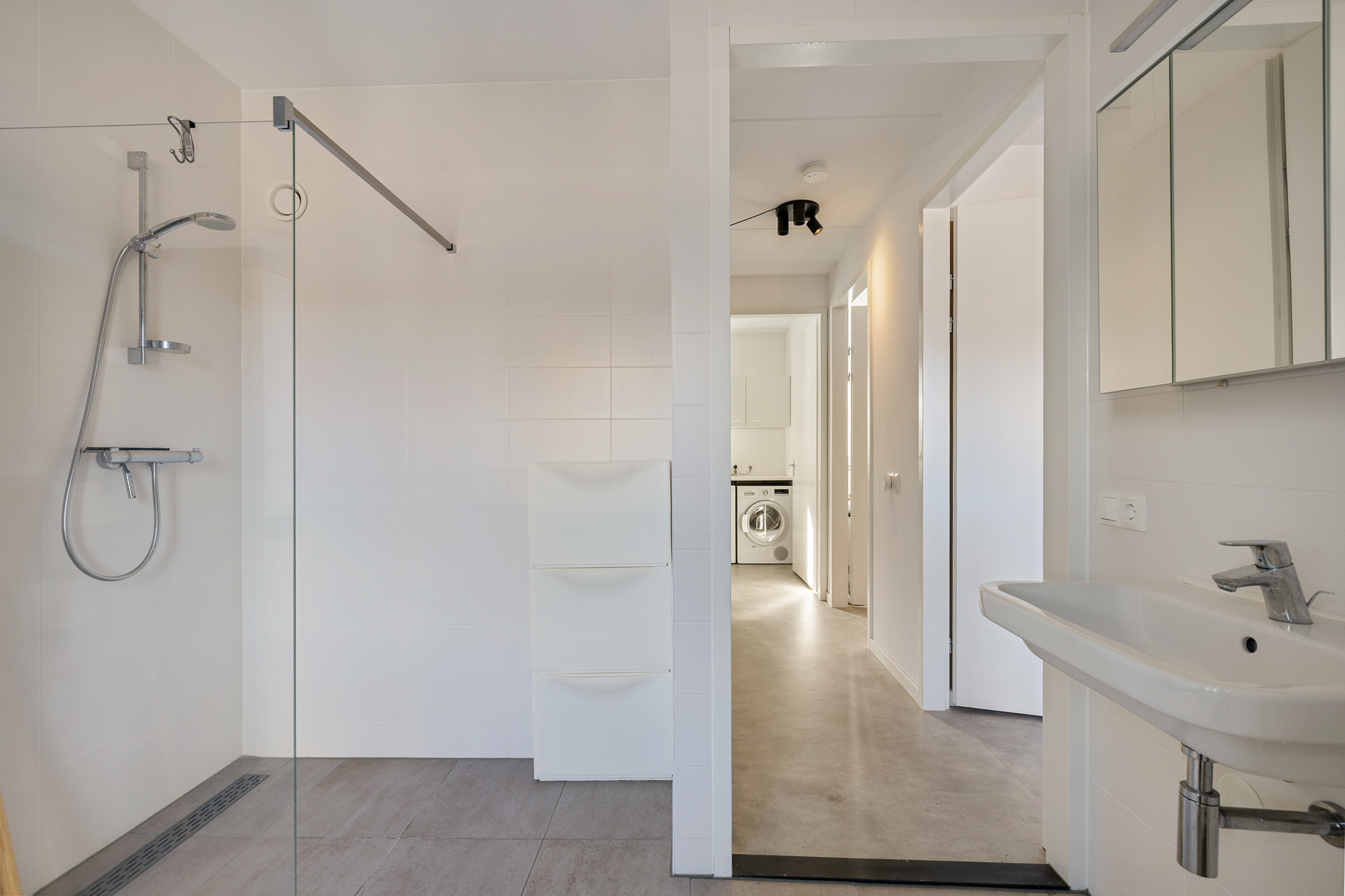 2e verdieping met nog 2 slaapkamers en 2e grote badkamer met zwevend toilet wastafel en inloopdouche. Voorts de witgoed ruimte met warmtepompopstelling.