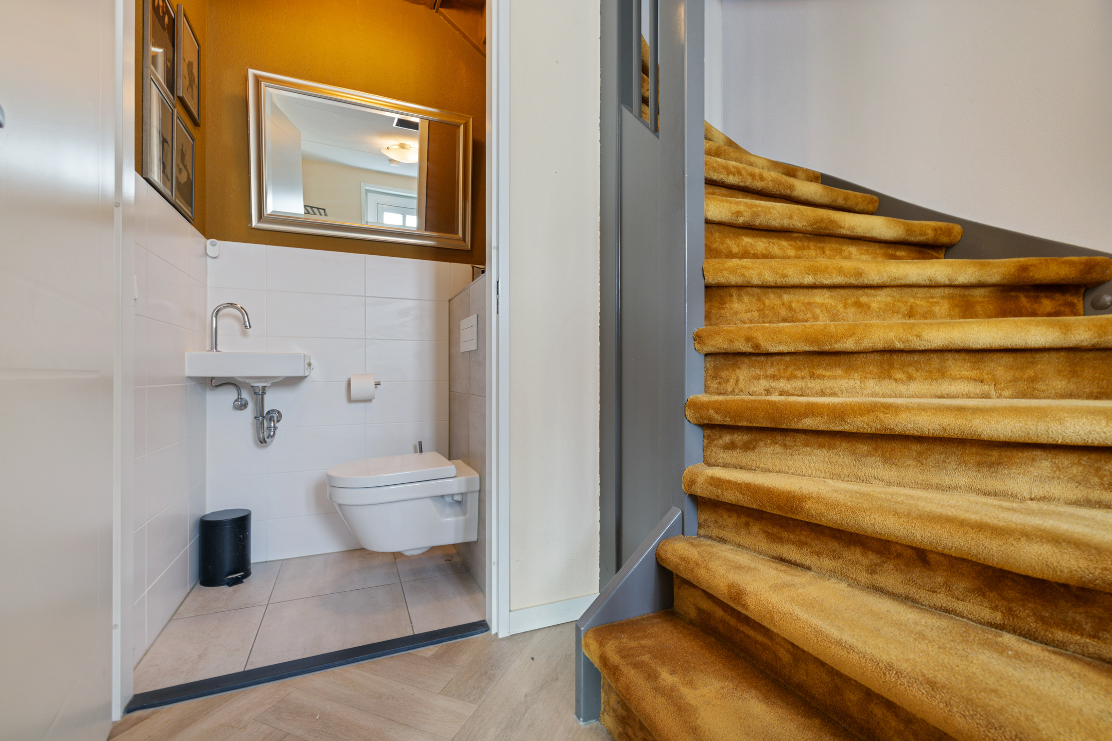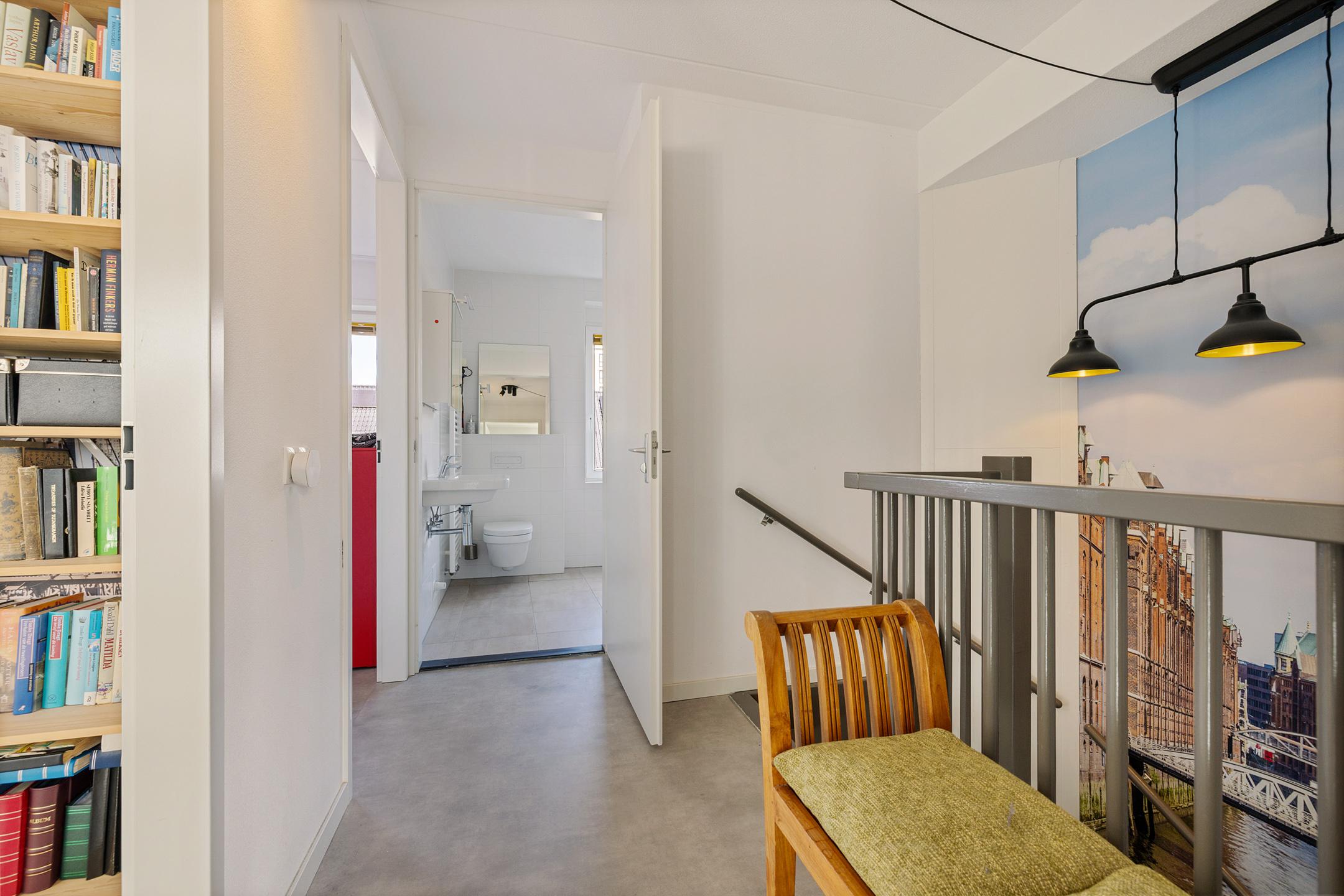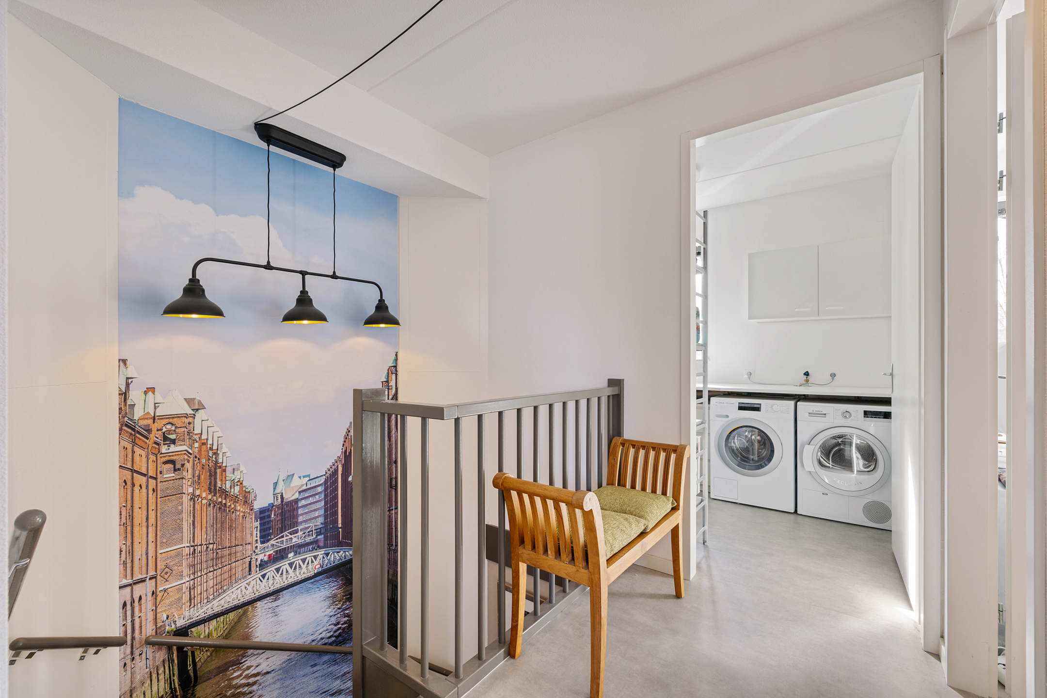 2e verdieping met nog 2 slaapkamers en 2e grote badkamer met zwevend toilet wastafel en inloopdouche. Voorts de witgoed ruimte met warmtepompopstelling.