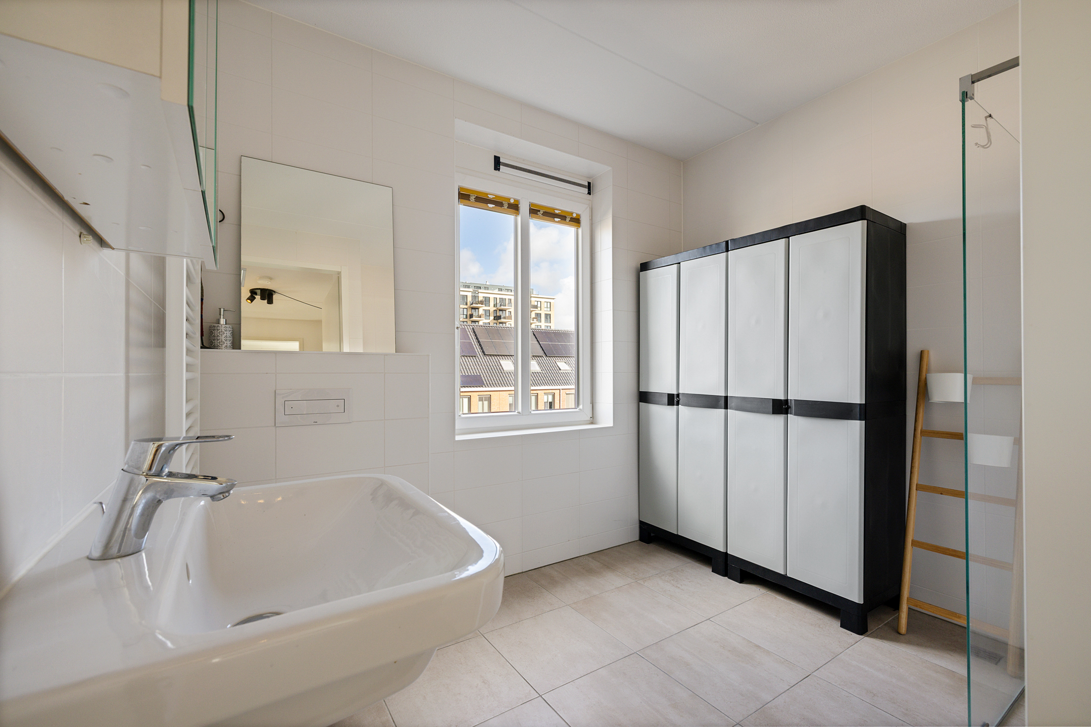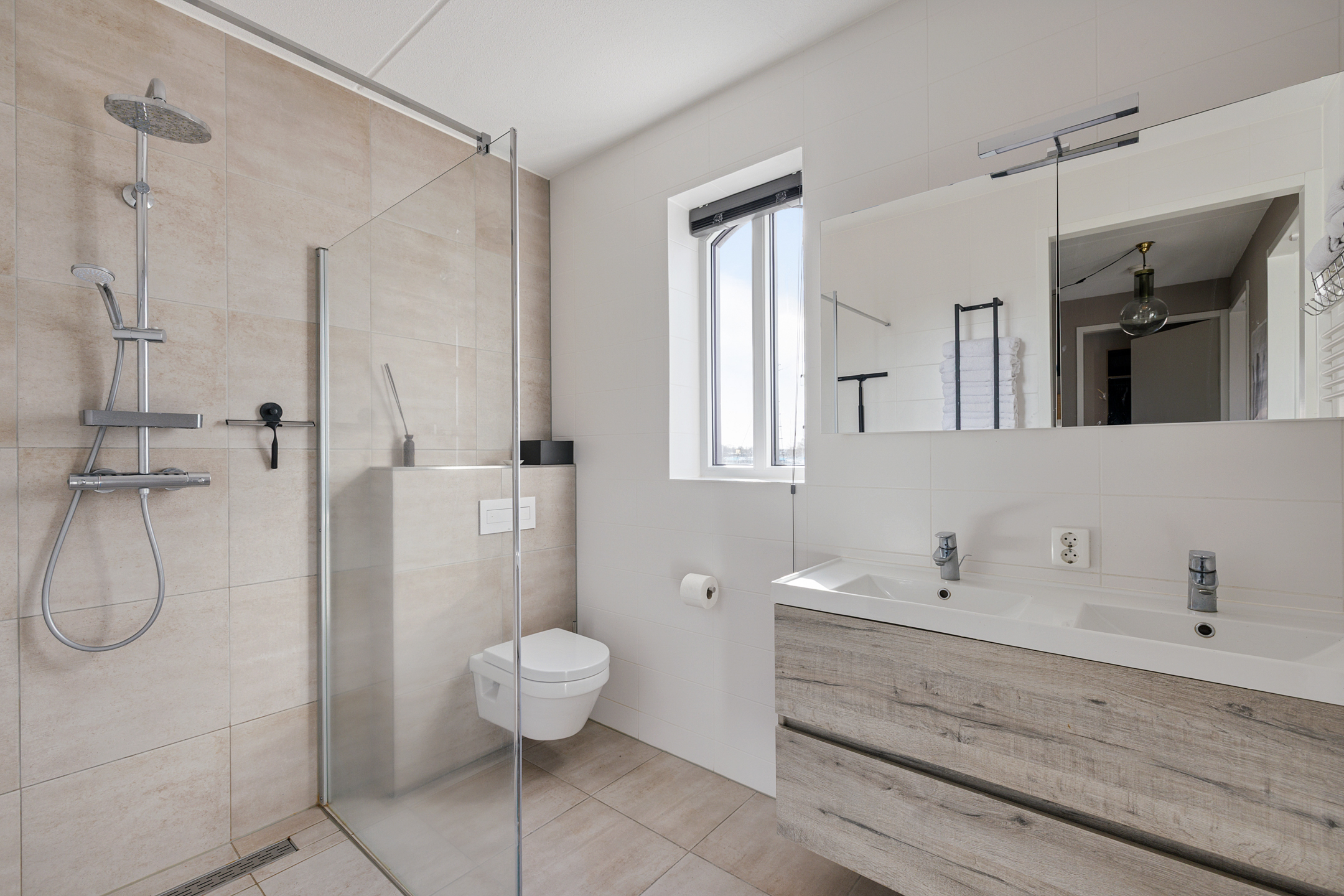 Tweede ruime slaapkamer aan de achterzijde. Moderne badkamer met wastafelmeubel, 2e zwevend toilet en inloopdouche.